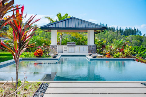 Outside, steps lead into an incredible pool with spa tub and in-pool Baja Shelf seating, all of which is ideally positioned to take in the captivating views of Molokai. The pool features a cool swim-through channel flanked by fire bowls that leads to the swim-up bar attached to the adjacent covered BBQ pavilion. A fabulous fire pit is located on the other side of the pool. The pool system is all top-quality Jandy pool equipment.